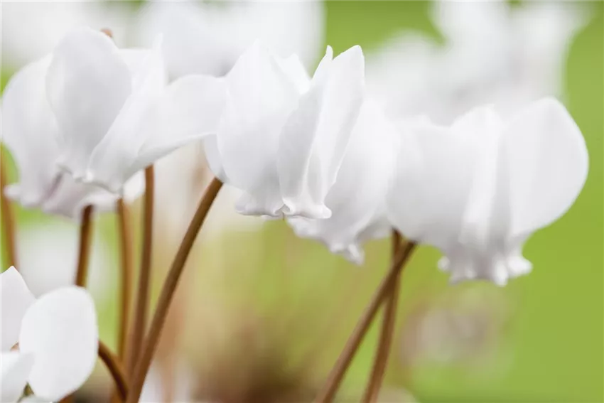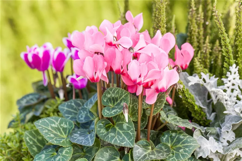 Cyclamen hederifolium 'Ive Ice White' Alpenveilchen machen nicht nur als Zimmer- und Freilandpflanzen eine gute Figur. Manche Sorten eignen sich auch gut als Schnittblumen. Sind die Bedingungen optimal, können sie rund zwei bis vier Wochen in der Vase halten, dazu sollten die Enden der Blütenstiele eingeritzt werden.