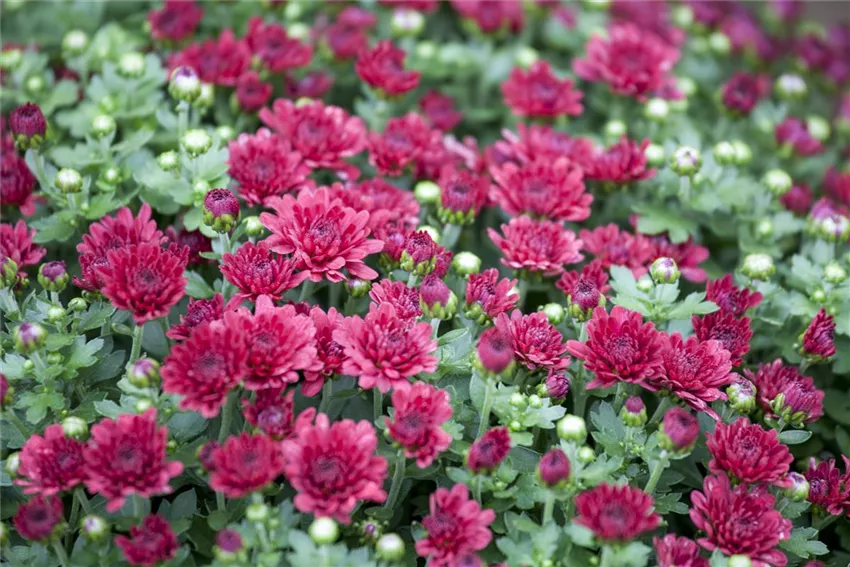 Chrysanthemum indicum Durch Züchtung entstand ein riesiges Sortiment mit zahlreichen Formen: einfache und gefüllte Blüten, ballförmig oder pomponartig. Ihrer langen Haltbarkeit wegen sind sie wertvolle Schnittblumen in der Vase. Allmählich verlieren sie ihr Image als Friedhofsblume – sie gehören zum Standard in bunten Herbststräußen. Die Blütenfarbe reicht von Weiß über Gelb, Rot, Rosa bis Violett.