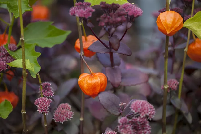 Physalis alkekengi var. franchetii Den Namen geben der Lampionblume die leuchtend orangefarbenen Früchte, die im Herbst zu mehreren an einem Stängel zu finden sind. Die etwa 1 Meter hohe ausdauernde Staude bereichert die Gärten im Herbst. Die Früchte sind beliebtes Beiwerk in Sträußen oder auch eingebunden in bunte Herbst-Kränze.