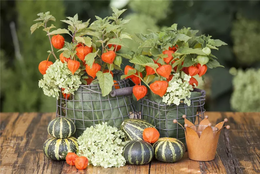Physalis alkekengi Wem die bunten Lampions nicht reichen, kann die Pflanze auch sehr gut in Pflanzenarrangements integrieren oder im Topf gepflanzt zur übrigen Herbstdekoration dazu stellen. Besonders gut passt die Lampionblume in einem Arrangement zur Moorheide. Die herbstlichen Farben der beiden Pflanzen ergänzen sich perfekt und erzeugen so eine ruhige Atmosphäre. Ein paar Zierkürbisse dazu und fertig ist die Herbstdekoration auf dem Gartentisch oder dem Balkon.